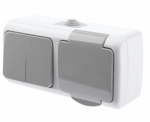 5-702-03 Intro Блок розетка 2P+E + выключатель двойн., 10(16)А-250В, ОУ, Atlantic, IP54, серый