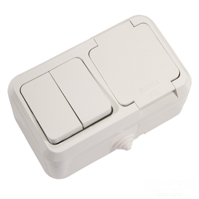 Makel Менекше Белый Блок Выключатель 2-клавишный + Розетка с крышкой IP44 открытая установка 18351