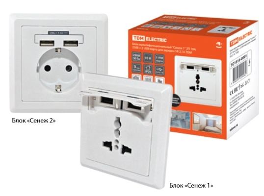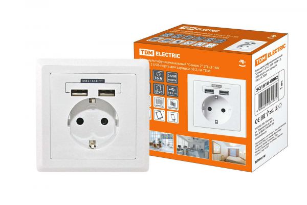 TDM Сенеж 1 Блок мультифункциональный 2П 10А 250В + 2 USВ-порта для зарядки 5В 2,1А SQ1816-0001