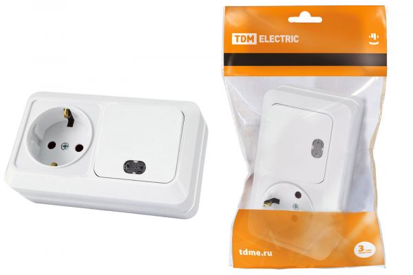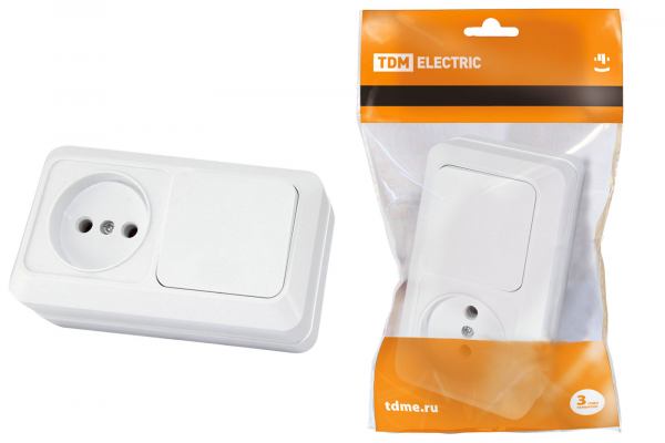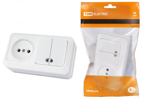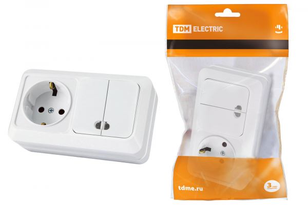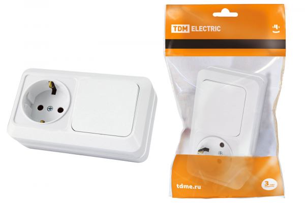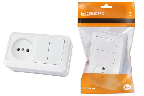 TDM Ладога Белый Блок комбинированный: выключатель 1-клавишный открытая установка 10А + розетка 2П+З 16А 250В БКВР IP20 SQ1801-0103