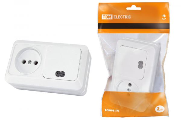 TDM Ладога Белый Блок комбинированный: выключатель 2-клавишный открытая установка 10А + розетка 2П 10А 250В БКВР IP20 SQ1801-0108