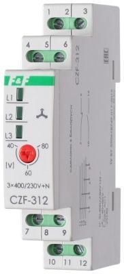 Реле контроля и наличия фаз CZF-312 (монтаж на DIN-рейке 35мм; регулировка порога; без задержки отключения; 3х400/230+N 2х8А 1Z 1R IP20) F&F EA04.001.007