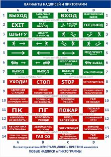 «Кристалл» – первые в России световые табло, изготовленные с применением светодиодов белого свечения. Равномерно распределенная засветка делает надпись контрастной к фону при любом освещении. Буквы и символы четко видны даже в темноте и в условиях задымленности. Табло способны работать в условиях широкого диапазона температур: от -30 до +55. Стандартный набор надписей и пиктограмм (см. рис.) соответствует нормам аварийного освещения (размер и форма символов, цвет фона). Доступно изготовление указателей с любыми изображениями и надписями на заказ.Гарантия 5 лет.