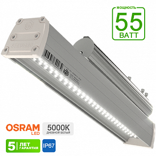 Характеристики сжато: Мощность: 55 Ватт / Производительность: 7800 Лм / Цветовая температура: 5000K / Светодиод: OSRAM / КСС: Д (120°) / IP67 / от -50° до +60° / Алюминий / Электронная часть: Argos (IP67) / Защита от перенапряжения / Гальваническая изоляция / Защита от 380 Вольт / Соответствие ГОСТ, IEC / 176-264AC/250-370DC / 100 000 часов / 5 лет / 520х80х136 / Нетто: 2 Кг
