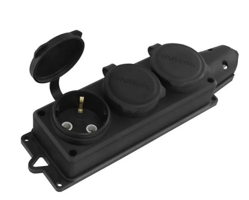 Розетка каучук трехместная с заземлением IP44 компакт UNIVersal Однофазная 3-х местная колодка с заглушками, каучук UNIVersal 1323 применяется для монтажа удлинителя с проводом любой марки, сечения и длины. Для изготовления данной модели используется прочный, надежный и качественный материал. Для защиты от попадания к контактным группам пыли и влаги предусмотрены специальные крышки.