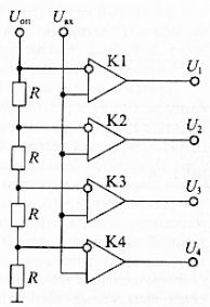 Схема содержит четыре компаратора K1…K4. Опорное напряжение подано на инвертирующие входы через резистивный делитель. Если сопротивление резисторов одинаковое, то на инвертирующих входах компараторов напряжение составит n*Uоп/4, где n порядковый номер компаратора. Входное напряжение подано на соединенные вместе неинвертирующие входы. В результате сравнения входного напряжения с опорным на выходах компараторов получится унитарный цифровой код входного напряжения.