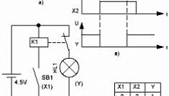 Понять только что сказанное поможет контактная схема, представленная на рисунке 2б: нажатие на любую из кнопок (высокий уровень) или на обе кнопки сразу, приведет к свечению лампочки (высокий уровень). В данном случае кнопки это входные сигналы X1 и X2, а лампочка выходной сигнал Y. Чтобы сказанное было проще запомнить, на рисунках 2в и 2г приведены временная диаграмма и таблица истинности соответственно: достаточно проанализировать работу показанной контактной схемы с диаграммой и таблицей, как все вопросы исчезнут.