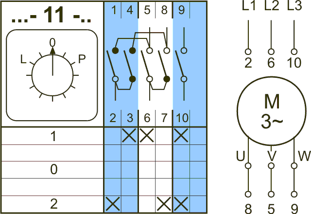 На рисунке выше приведен пример использования пакетного переключателя для реверсирования трёхфазного асинхронного двигателя — контакты в 1 и 2 положении переключаются так, что изменяется порядок чередования фаз, в положении 0 — все разомкнуты.