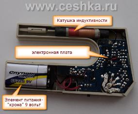 Внутри то же нет ничего сверхестественного устройство металлоискателя несложное. Электронная плата с расположенными на ней радиодеталями, батарейка «крона» и катушка индуктивности.