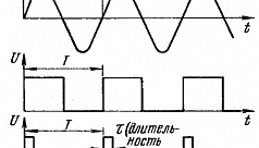 Ниже синусоиды показаны прямоугольные сигналы: меандр и прямоугольный импульс. Они также периодические с периодом T. Длительность импульса обозначена как τ (тау). В случае меандра длительность импульса τ равна длительности паузы между импульсами, как раз половина периода T. Поэтому меандр является частным случаем прямоугольного сигнала.