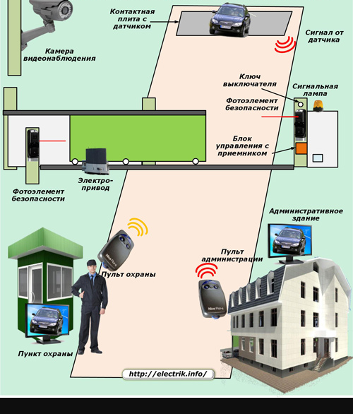 Световая сигнальная лампа устанавливается для удобного освещения въезда. Приемник сигналов от передатчика, вмонтированный в блок управления, вместе с отдельным электроприводом закреплен на одной из опор стоек. Около него находится закрытая распределительная коробка с электрическими кабелями, соединяющими все вышеперечисленные объекты со стационарным пультом и вводным электрощитом с защитами.