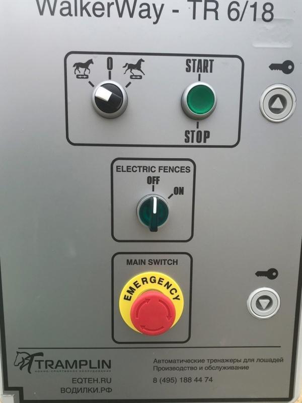В основе системы управления — программируемое реле ОВЕН ПР200. В зависимости от комплектации, изделие может быть с кнопочным или сенсорным пультами управления. В кнопочном пульте управления оператор отдает команды механическими переключателями, используя два автоматических режима. В сенсорном блоке управления, помимо 20 различных программ тренировок, на экран выводятся текущие параметры работы системы: пройденный путь, время работы, скорость, а также возможные неисправности и ошибки. Предусмотрена возможность создания индивидуальной программы тренировки лошади с последующей записью в память контроллера.
