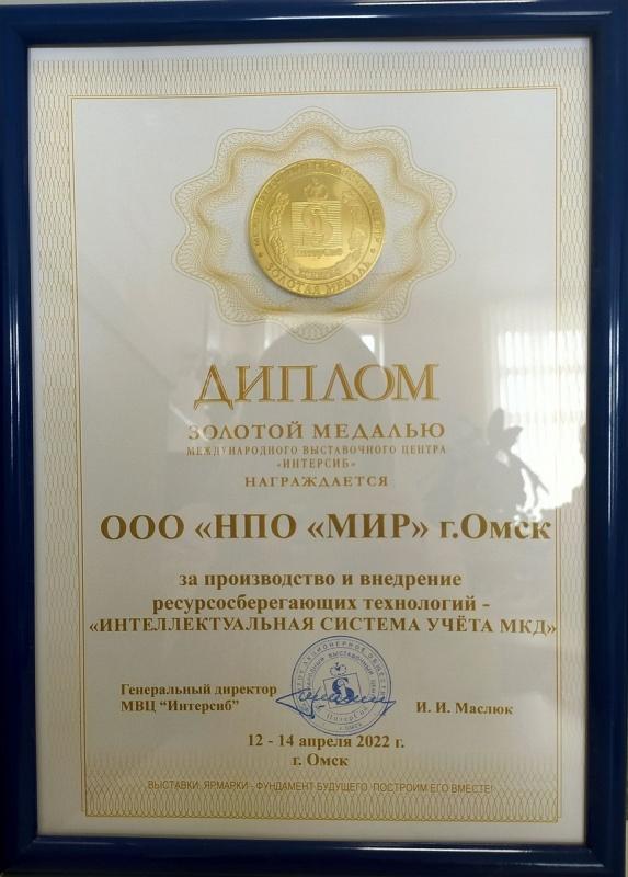 В апреле 2022 г. в Омске прошел XXIII Сибирский промышленно-инновационный форум «Промтехэкспо-2022». Этот выставочный год ознаменовался для НПО «Мир» пополнением в виде золотой медали за доклад о производстве и внедрении ресурсодобывающих технологий — «Интеллектуальной системы учета МКД».